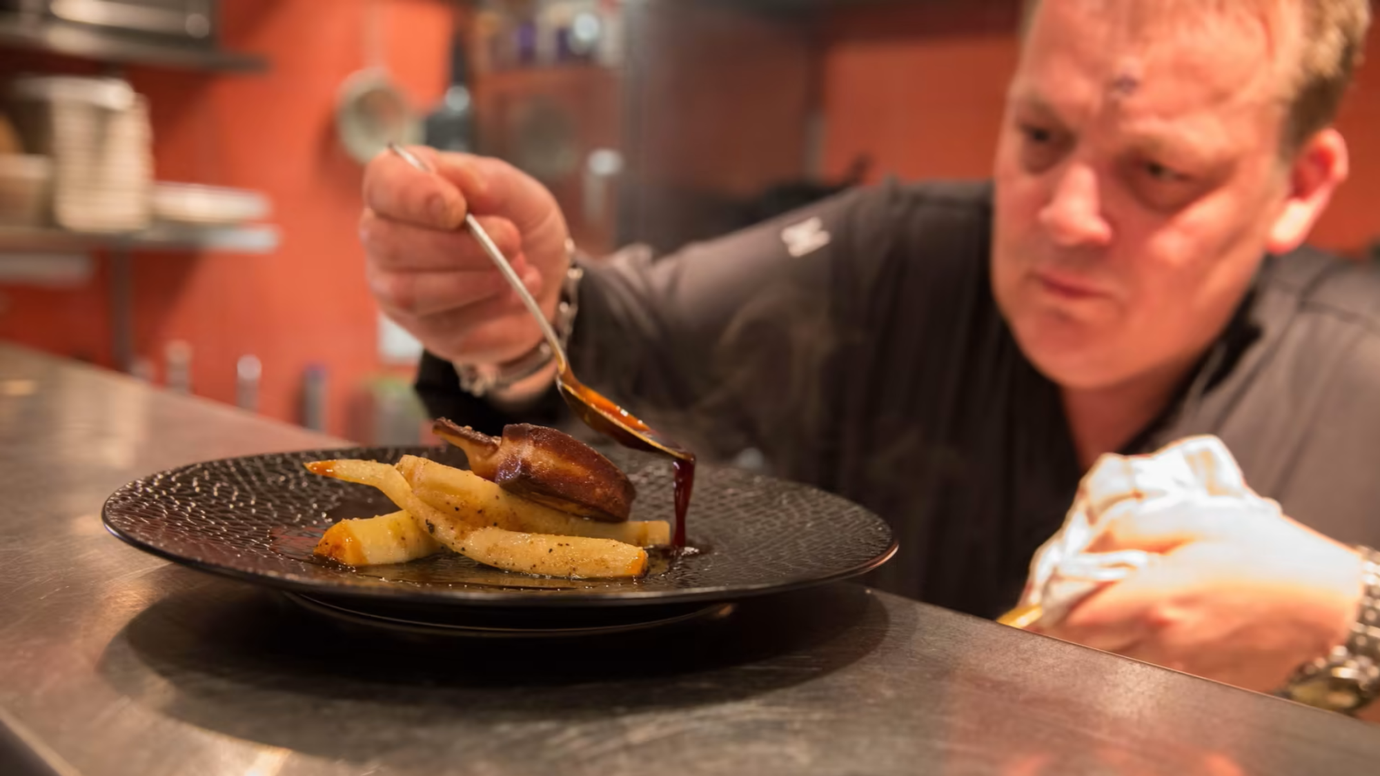 Hij toont ook graag zijn speelse kant, bijvoorbeeld door vitello tonnato te herinterpreteren met zachte pulpo en een sorbet van rode paprika. Deze keuken is rijk, dat blijkt ook uit de huisspecialiteiten met ganzenlever en kalfszwezeriken.